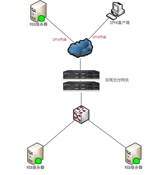 參見如下的網絡邏輯示意圖,應?交付控制器作為 IPv6 和 IPv4 的協議網關來部署,同時提供數據中心 Web 應用服務器集群的負載均衡等應用交付的功能。數據中心內部的應用程序還沒有經過 IPv6 的改造,依然是 IPv4 的環境,應用交付控制器分別連接 IPv6 和 IPv4 兩個網絡,通過虛擬服務器方式將數據中心的 Web 應用發布在 IPv6 的網絡中(圖中以虛擬服務器vs_main: 2017:1::158:80 對 IPv6 的客戶端發布),IPv6 網絡中的客戶端可以訪問應用交付網關發布的 IPv6 的虛擬服務器,通過代理的方式將請求轉發給數據中心內部的真實服務器,得到響應內容之后將返回的內容再轉換成 IPv6 數據包返給客戶端,從而保證客戶端能夠在?個 IPv6 的網絡中訪問數據中心 IPv4 的應用。