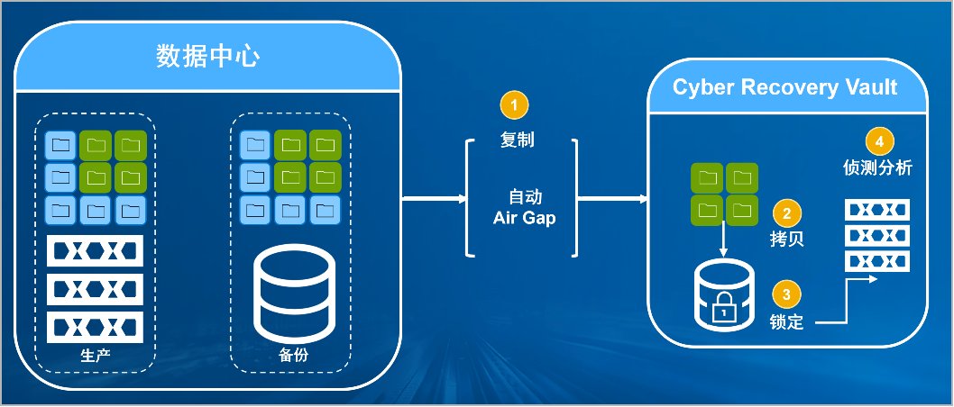 k8凱發防勒索病毒方案將生產中心備份數據復制到Vault區,復制后網絡自動斷開實現彈性隔離。Vault區的數據快速拷貝,并對拷貝版本加鎖(在鎖定期數據不允許刪除和修改)。Vault沙箱內對拷貝版本進行掃描分析,驗證數據是否完好。